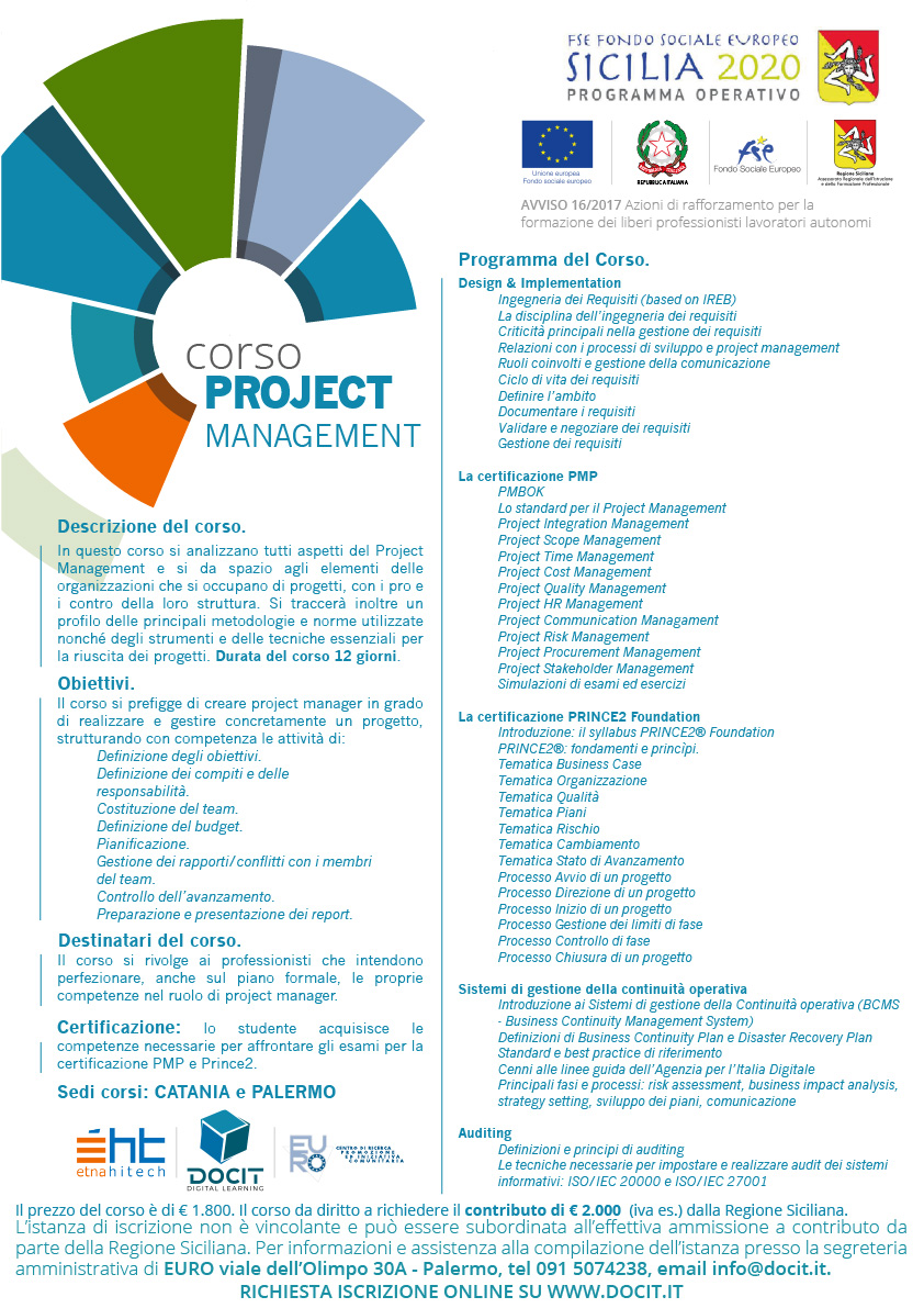 In questo corso si analizzano tutti aspetti del Project Management e si da spazio agli elementi delle organizzazioni che si occupano di progetti, con i pro e i contro della loro struttura. Si traccerà inoltre un profilo delle principali metodologie e norme utilizzate nonché degli strumenti e delle tecniche essenziali per la riuscita dei progetti. Durata del corso 12 giorni.